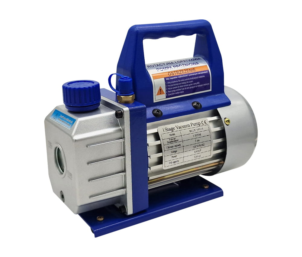 1. BLUE VP115 to solidna, jednostopniowa pompa próżniowa zaprojektowana do obsługi układów chłodniczych i klimatyzacyjnych. Dzięki precyzyjnej integralnej konstrukcji cylindra, urządzenie osiąga wysoką niezawodność oraz doskonałe parametry próżni. Duże okno olejowe zapewnia lepszą widoczność poziomu oleju, co minimalizuje ryzyko jego niedoboru. Wbudowany system filtracji (Oil Mist Trap) redukuje hałas oraz zapobiega zanieczyszczeniom.