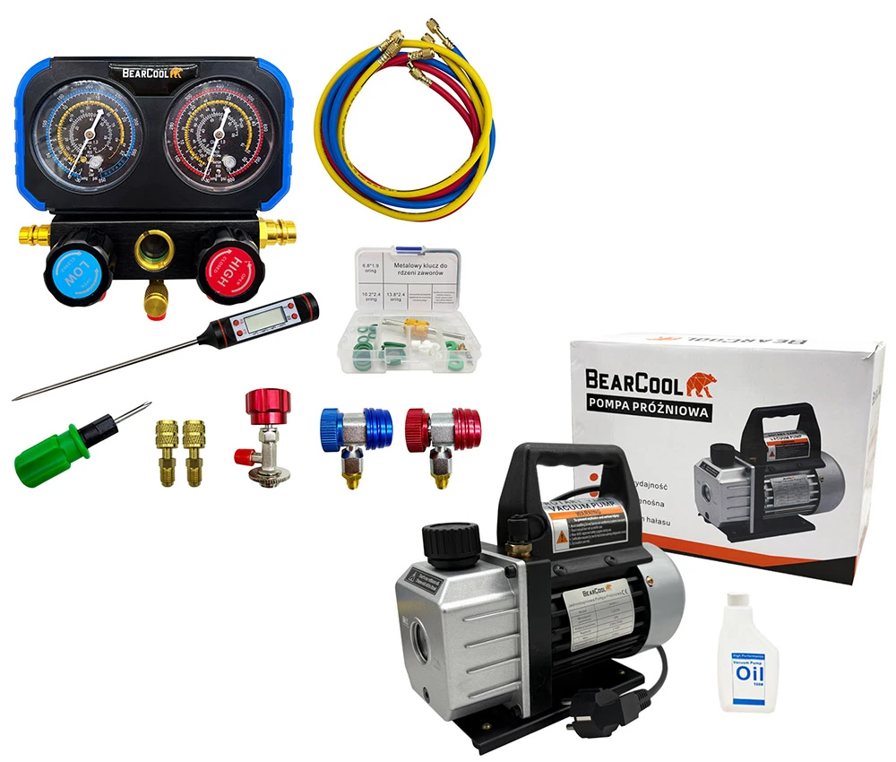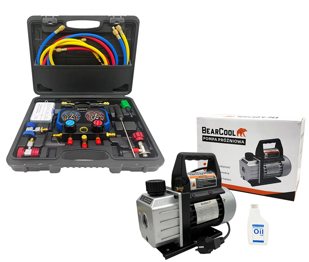 Pompa próżniowa BearCool + Zestaw manometrów R134a, R410A, R32, R22