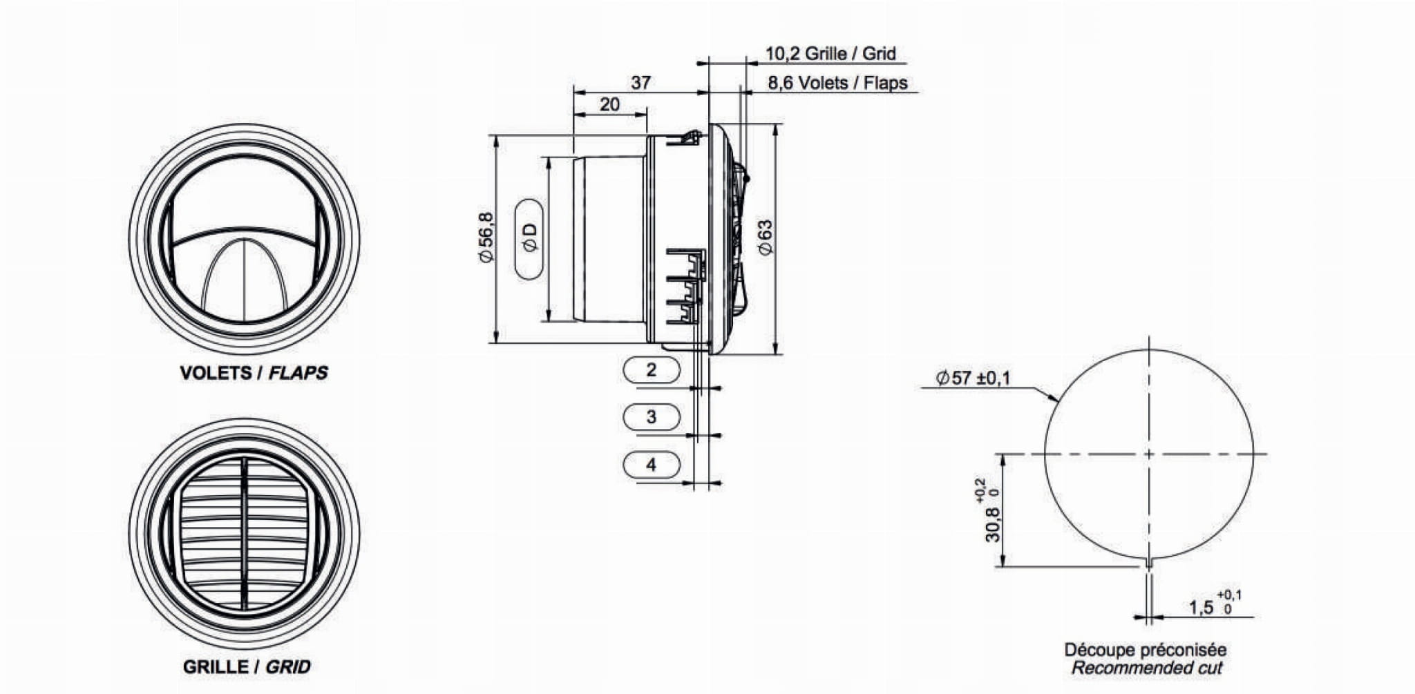 REGULOWANE DYFUZORY POWIETRZA SENSYO II 63 0° Z 2 KLAPKAMI