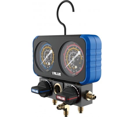 Zestaw podwójnych manometrów analogowych Value NAVTEK VRM2-B-0801 przeznaczonych do układów chłodniczych i klimatyzacyjnych.