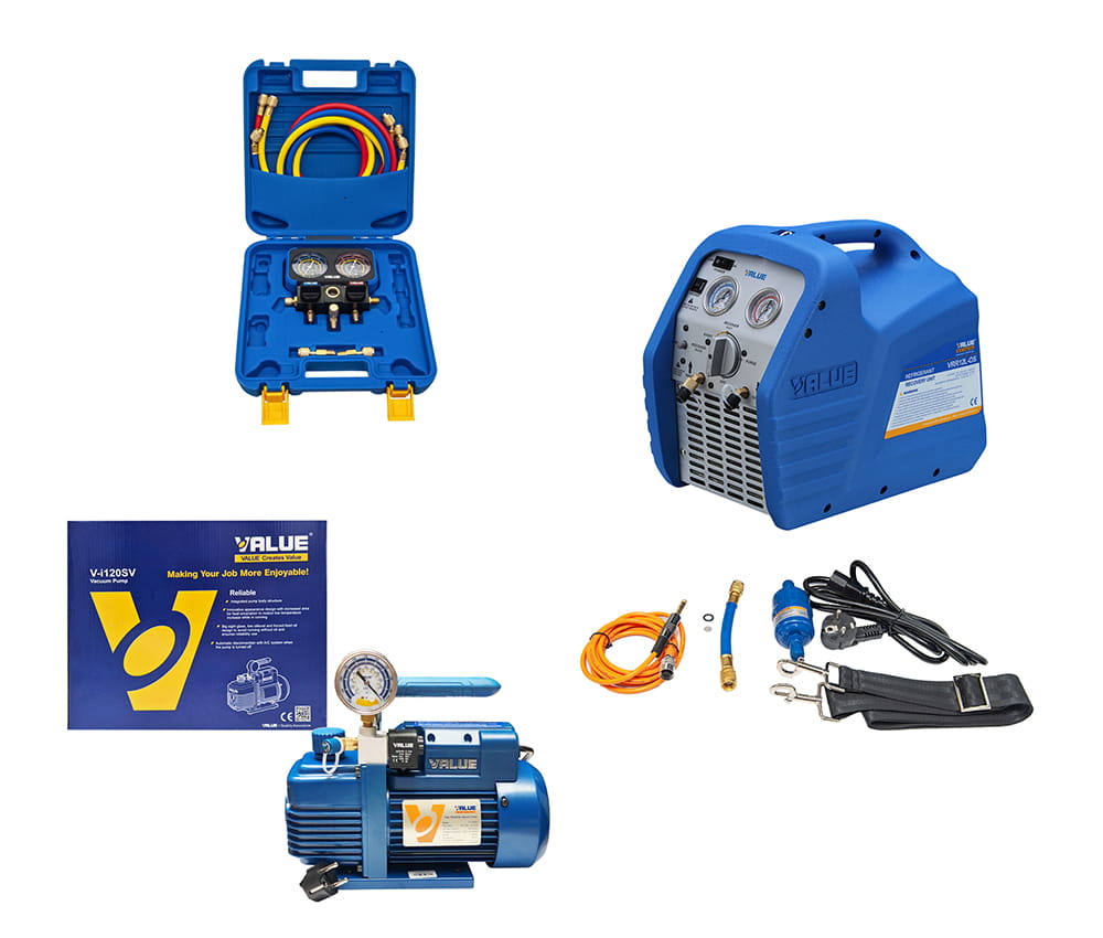 Stacja odzysku czynnika VRR12L-R32 + Pompa próżniowa + Manometry - Zestaw VALUE