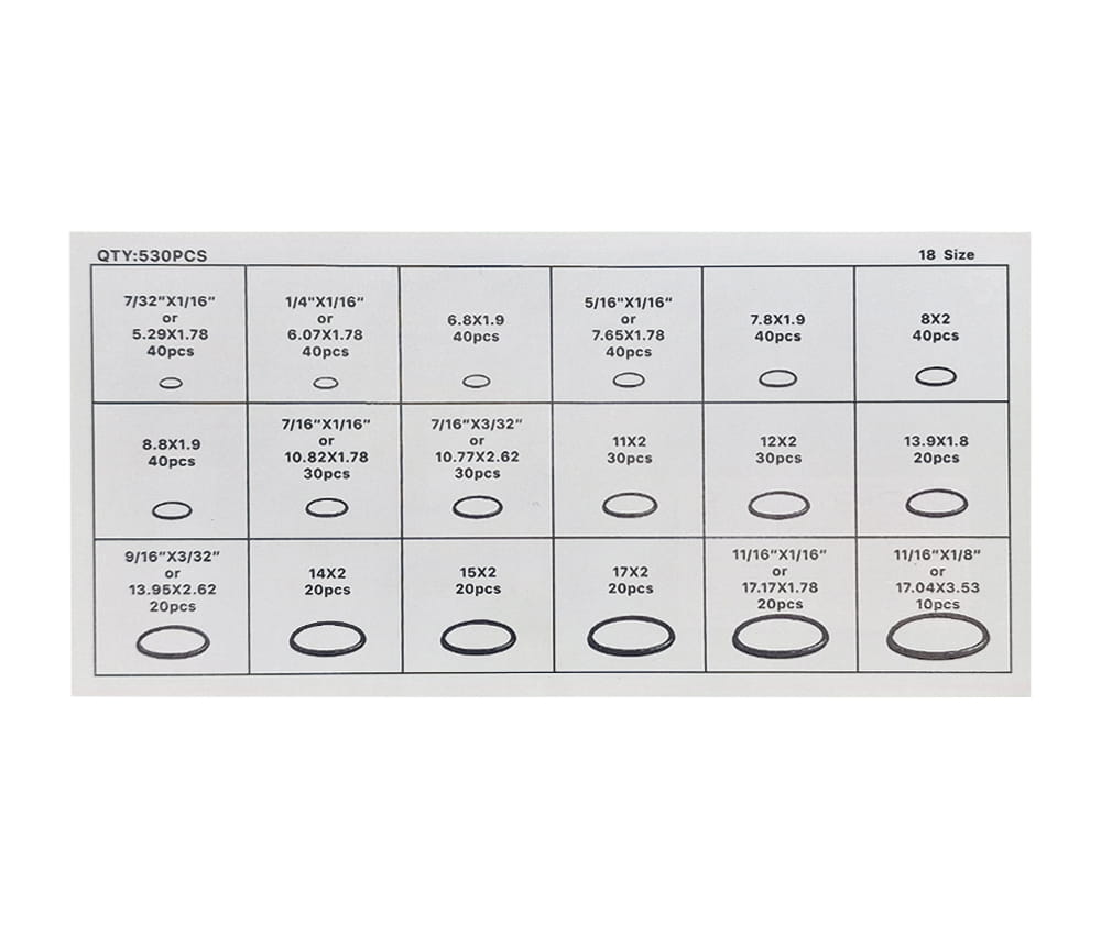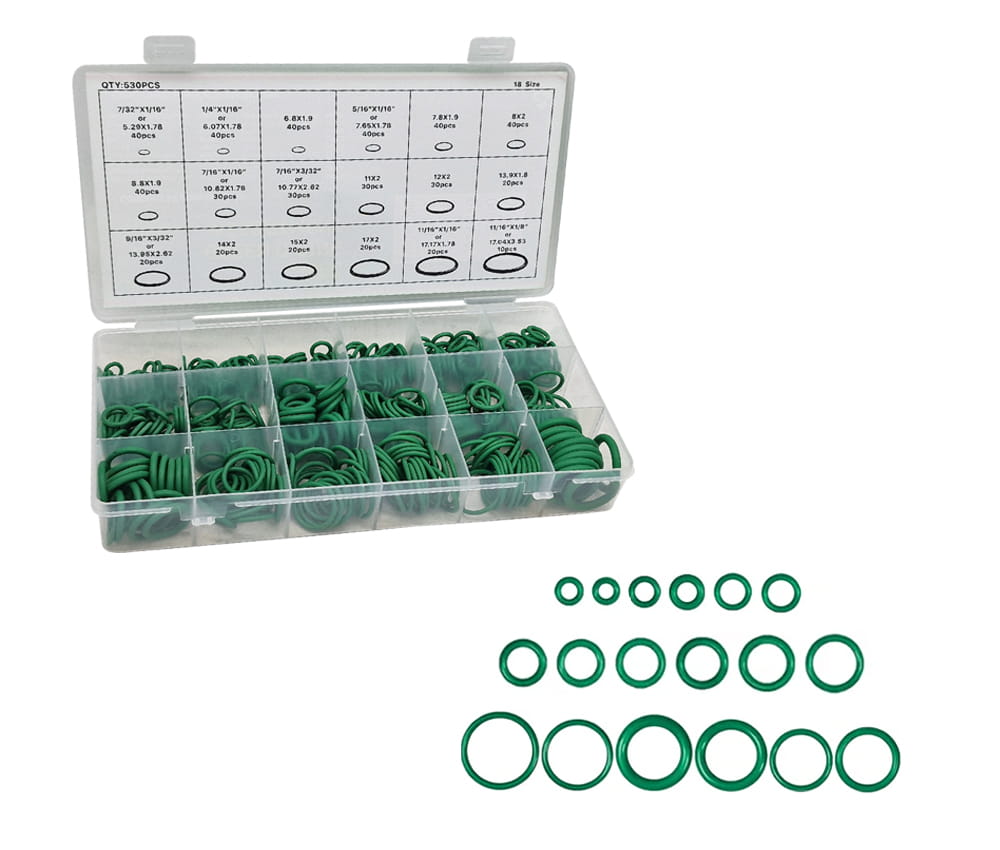 Uniwersalny zestaw oringów (530 szt., 18 rozmiarów), w plastikowym pudełku, przydatny w każdym warsztacie, służące do uszczelniania układu chłodniczego.