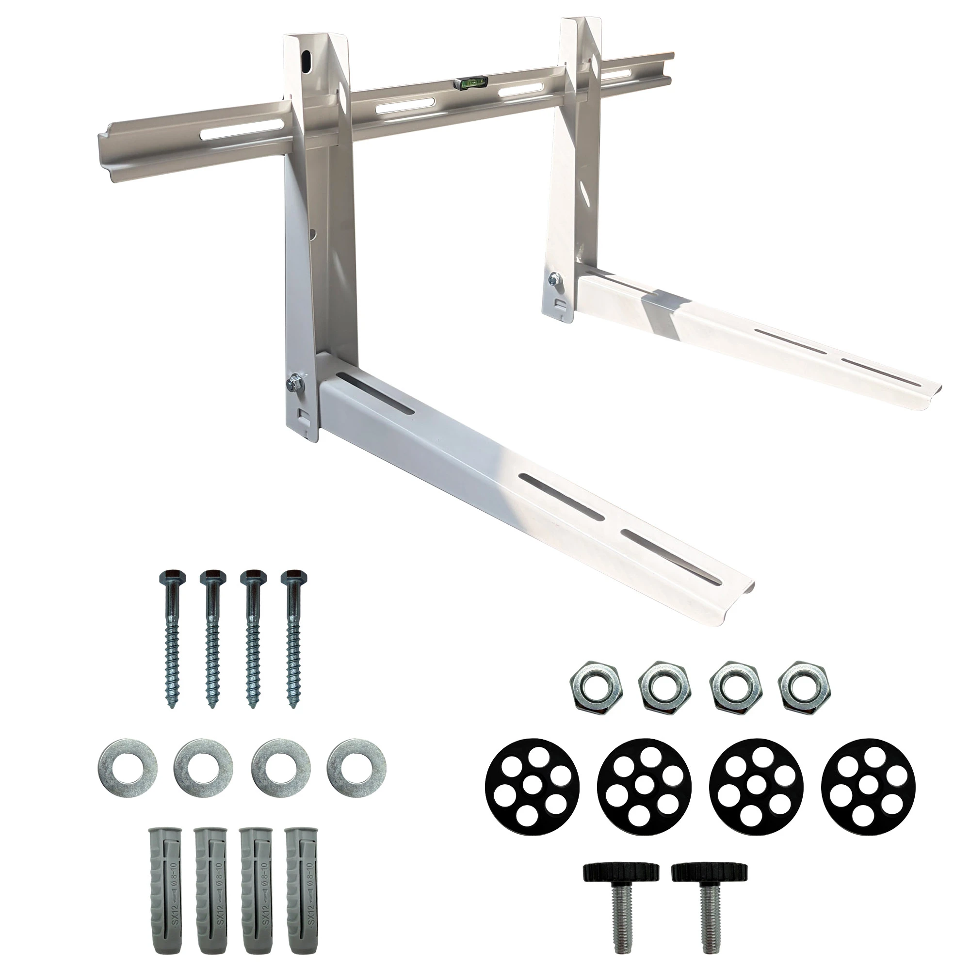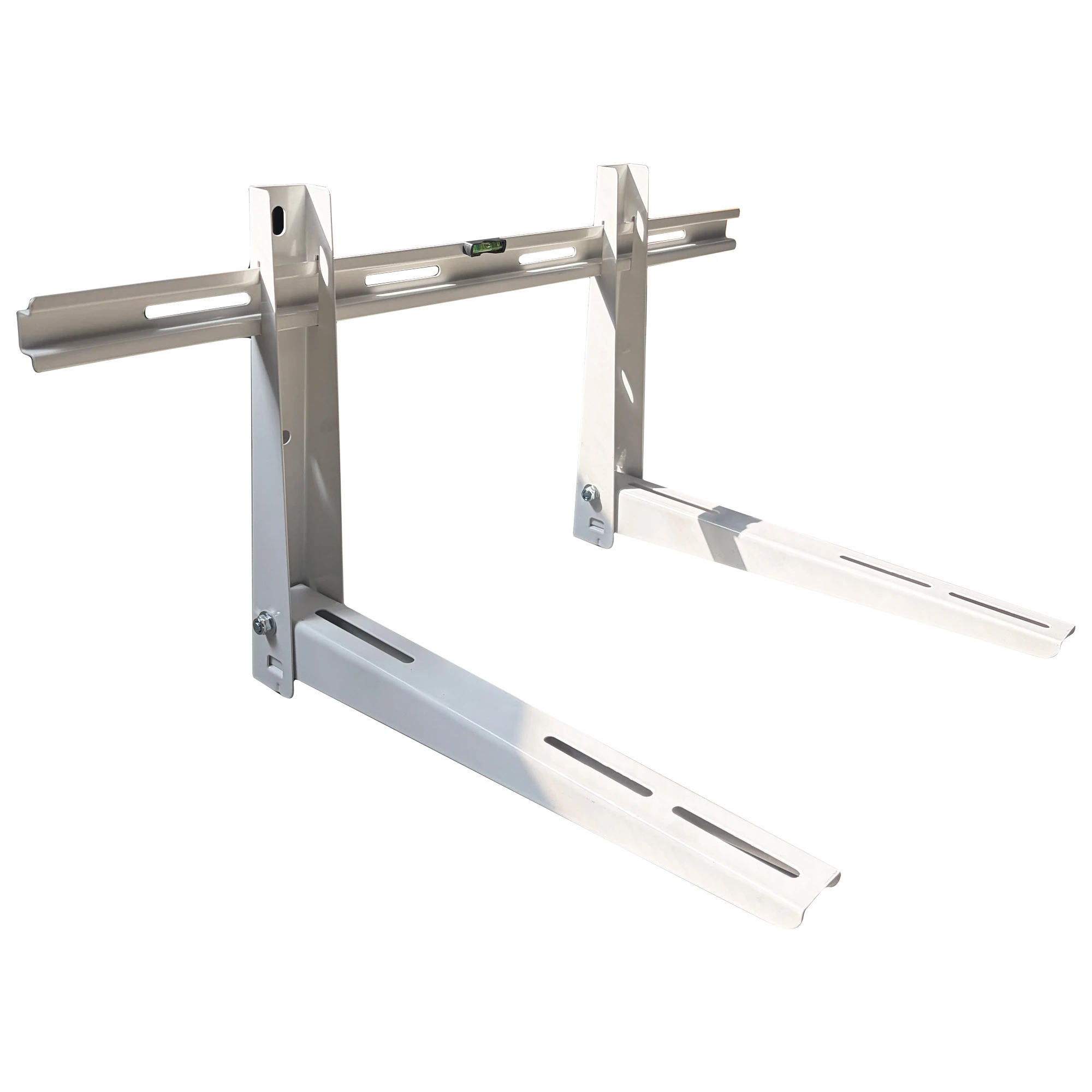 Solidny składany wspornik z poprzeczną belką montażową. Pozwala na szybki i prosty montaż jednostek zewnętrznych na ścianach. Konstrukcja pozwala na regulację odległości ramion po zamontowaniu belki poprzecznej. Gwarancja wytrzymałości. Malowany proszkowo, odporny na korozję i odbarwienia. W zestawie śruby montażowe, belka pozioma z poziomnicą oraz dwa składane ramiona.