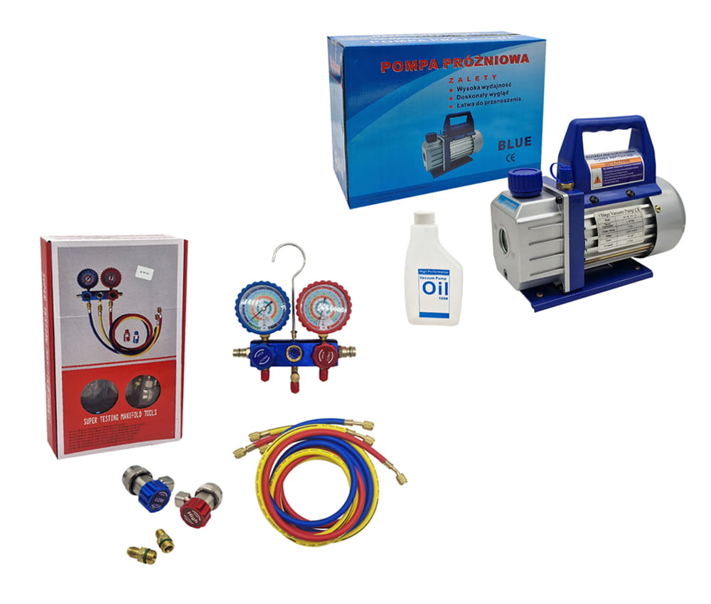 Zestaw Manometry z wężami + szybkozłącza HP LP R134a + Pompa próżniowa
