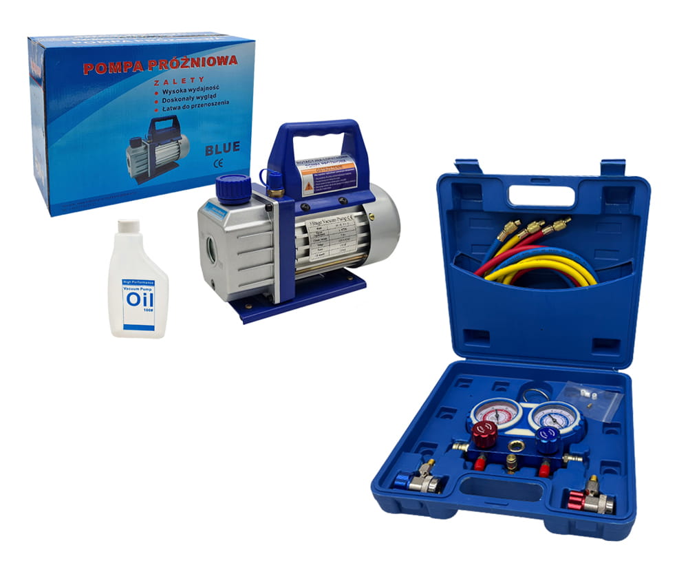 Zestaw Manometry z wężami + szybkozłączki HP LP R134a + Pompa próżniowa