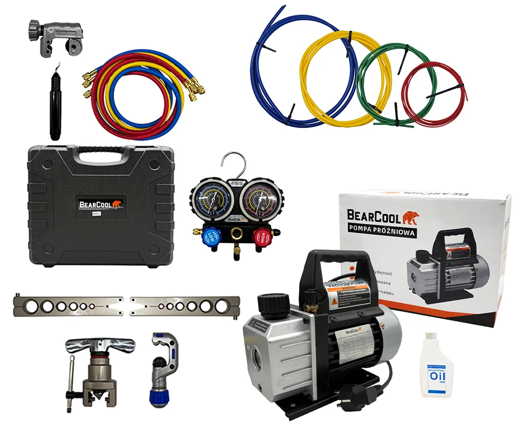 Zestaw narzędzi do klimatyzacji BearCool Pompa Manometry Pręty Akcesoria R32 R22 R410a R134a