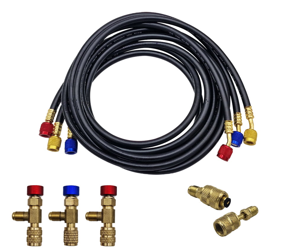 Zestaw węży serwisowych o długości 180 cm, zaprojektowany do pracy z nowoczesnymi czynnikami chłodniczymi wymagającymi wyższego ciśnienia, takimi jak R410A czy R32. Węże mają czarną konstrukcję z kolorowymi przyłączami (niebieskim, czerwonym i żółtym). Zestaw zawiera zawory ułatwiające kontrolę przepływu czynnika chłodniczego, co zwiększa wszechstronność i komfort użytkowania.